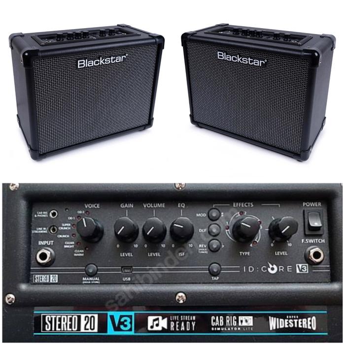 Blackstar ID Core Stereo 40 V3 Whether a beginner or a pro when you play we want you to have the best possible playing experience. That’s why the same R amp;D team responsible for our professional amps also designed the ID:Core V3. Unique innovations and connectivity give guitarists the best possible sound from the first time they plug in. Incredible tone and immersive Super Wide Stereo sound will inspire your playing. Guitarist-friendly controls combine with the power of programmability for an amazingly versatile tonal range from pristine clean to high gain. Live streaming to your smartphone is easy using a common TRRS cable and built-in USB connectivity allows you to easily record directly to your computer. Our free Architect software gives you access to our state-of-the-art Cab Rig Lite advanced cabinet simulator, along with deep editing and patch management. 20W (2x10W Super Wide Stereo) 6 Voices; Clean Warm, Clean Bright, Crunch, Super Crunch, OD1, OD2 2 x Blackstar 5″ speakers Effects; Delay x 4 Modulation x 4 Reverb x 4 Patented ISF (Infinite Shape Feature) Footswitchable